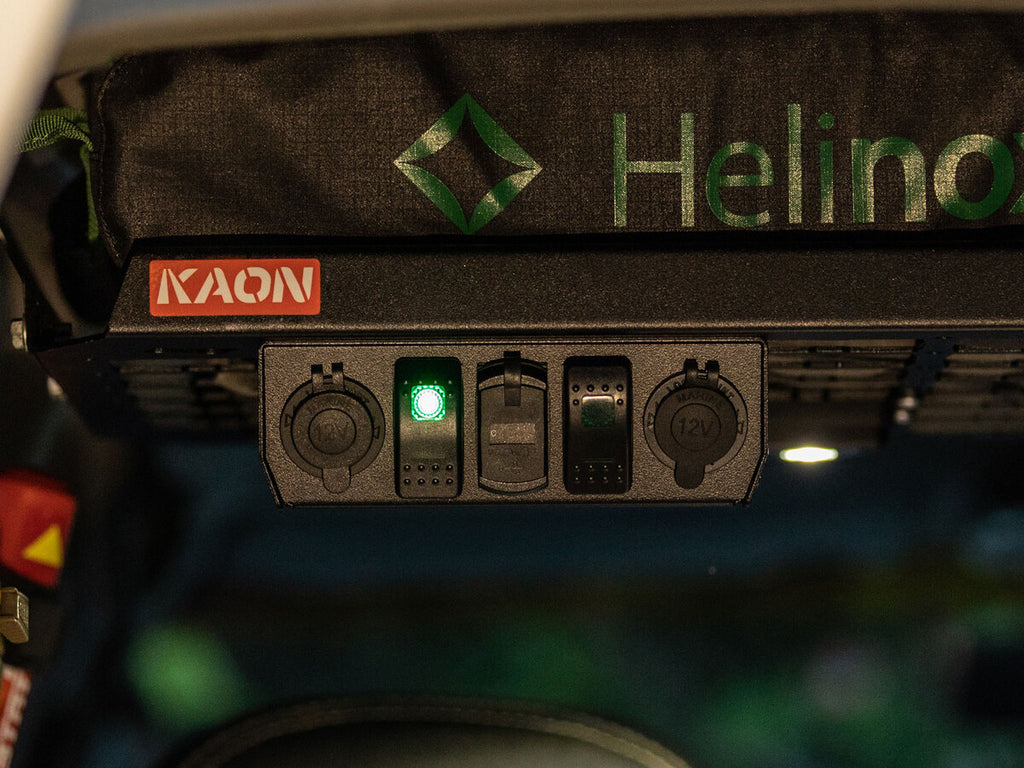 - The Electrical Console features two openings for standard 12V accessory sockets and three rocker switches.