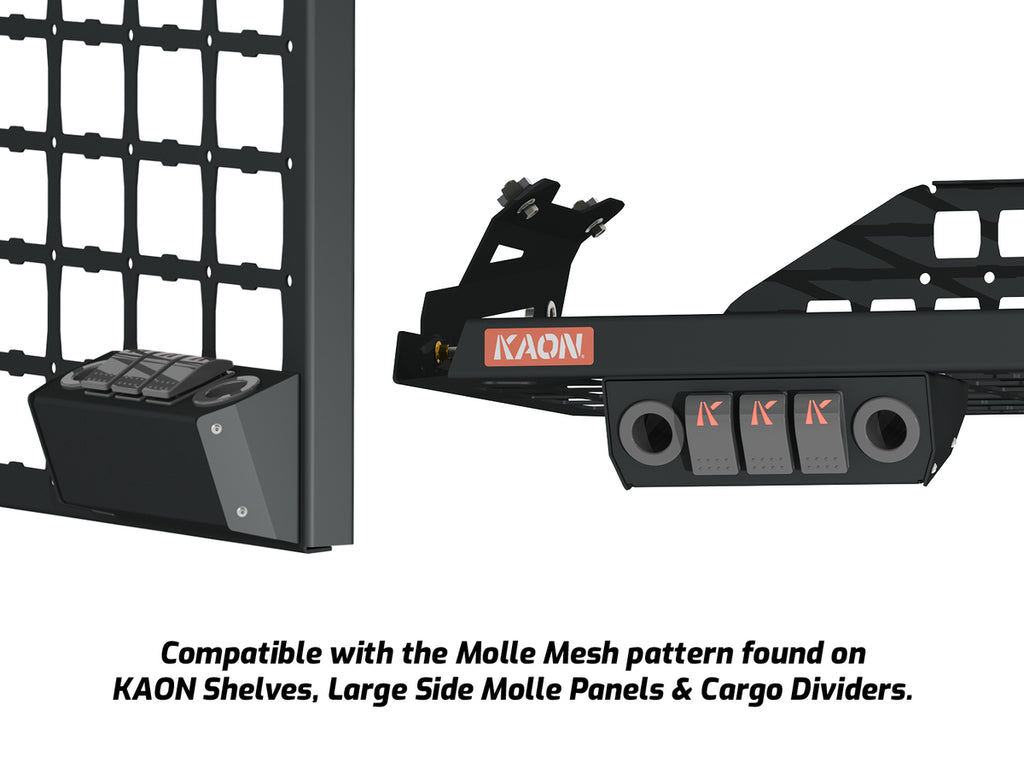 - Compatible with standard KAON Molle Mesh, including the KAON Standalone Rear Roof Cargo Shelf, KAON Rear Side Window Molle Panels & KAON Rear Tailgate Window Storage Basket.